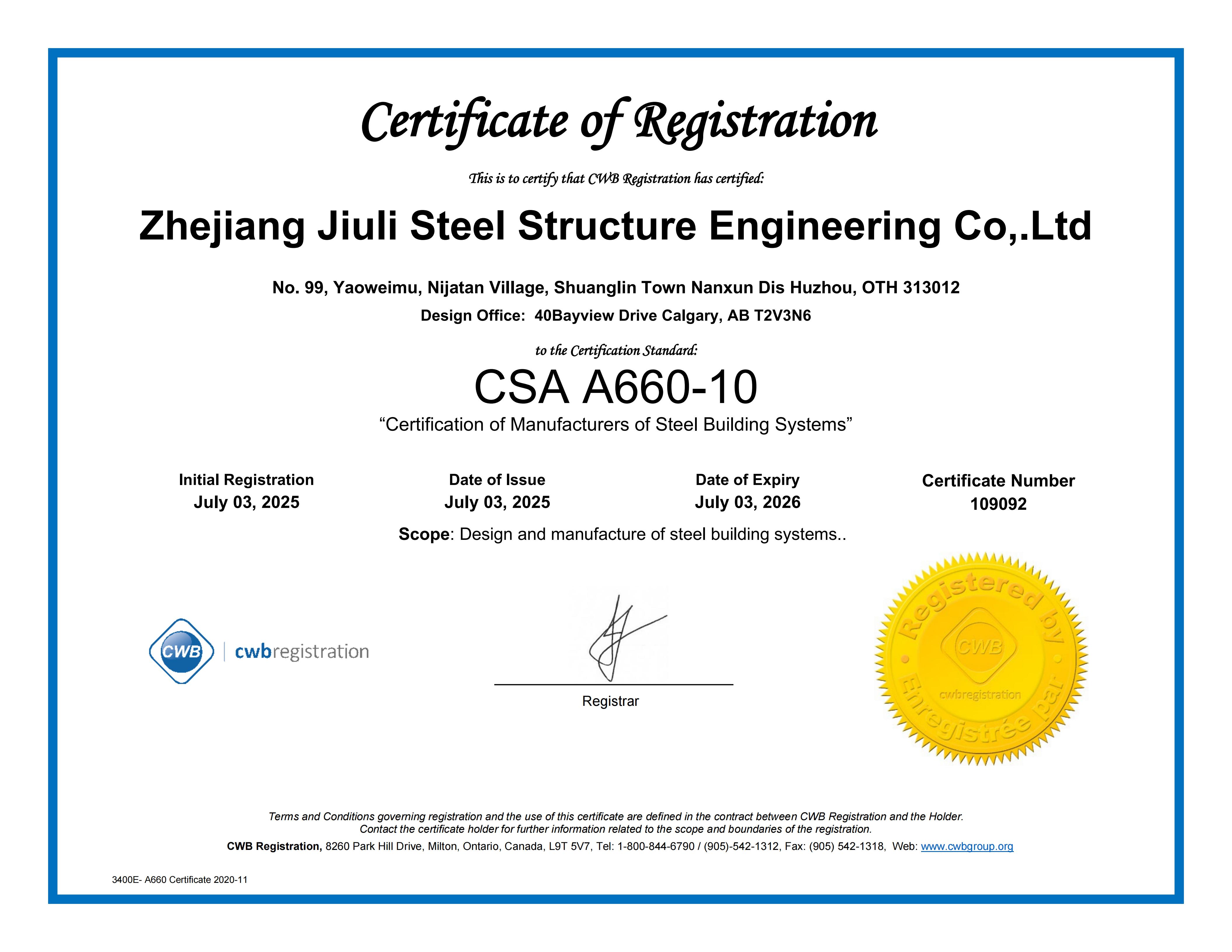 Zhejiang Jiuli Steel Structure Engineering Co., Ltd., founded in February 2001, is based in Huzhou City, the core area of the booming economy of the Yangtze River Delta in China. As a wholly-owned subsidiary of Jiuli Group, our company has not only been awarded honors such as Contract-abiding and Credit-worthy Unit, High-tech Enterprise, and AAA Credit Enterprise in Huzhou City but also holds important memberships in the China Steel Structure Association and the Steel Structure Branch of the Zhejiang Construction Industry Association, demonstrating our authoritative position and outstanding influence in the industry.